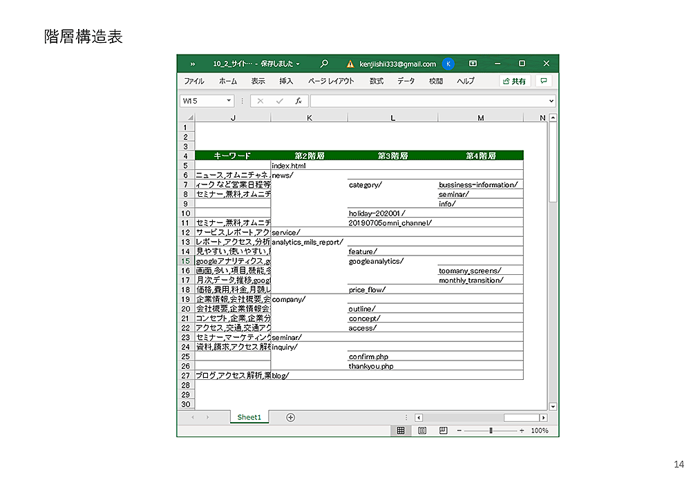 URLの「/」が増えていくと、階層が深まっていきます。サイト構成表を作ったときにブラウザのアドレス欄からコピペしただけのURLでは、その階層の関係が分かりにくくなっています。そして、いちいち全部URLを全部読み込むのはページが多くなると大変です。