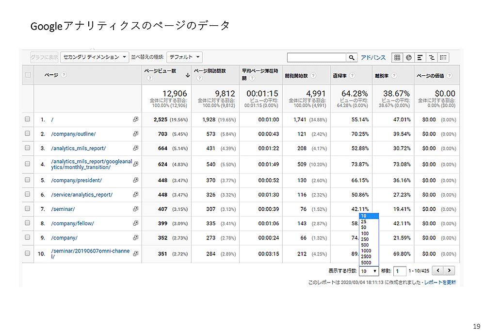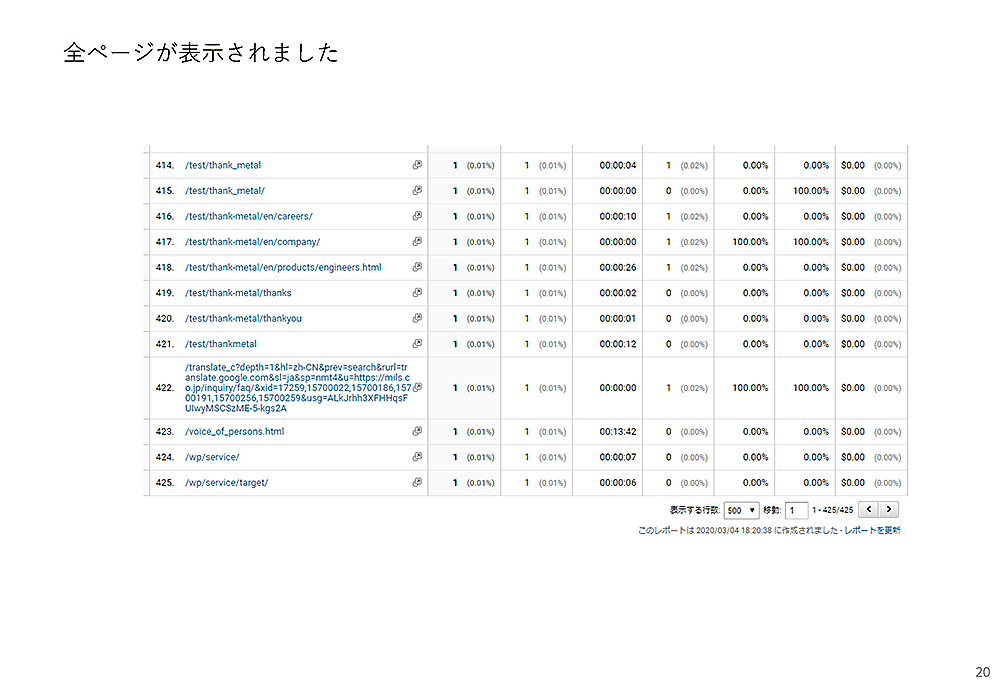 表示するページ数はプルダウンから選ぶことができ、最大で5000行まで表示できます。この例のサイトは425ページですので、「500」を選択すれば全ページ表示できます。