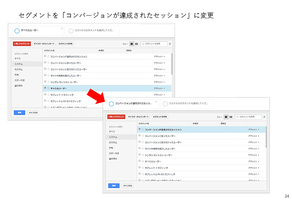 また、Googleアナリティクスの「セグメント機能」を使って「コンバージョンが達成されたセッション」のデータを見るようにし、その状態で「すべてのページ」を見れば、どのページが目標到達に深く関与しているかも分かります。