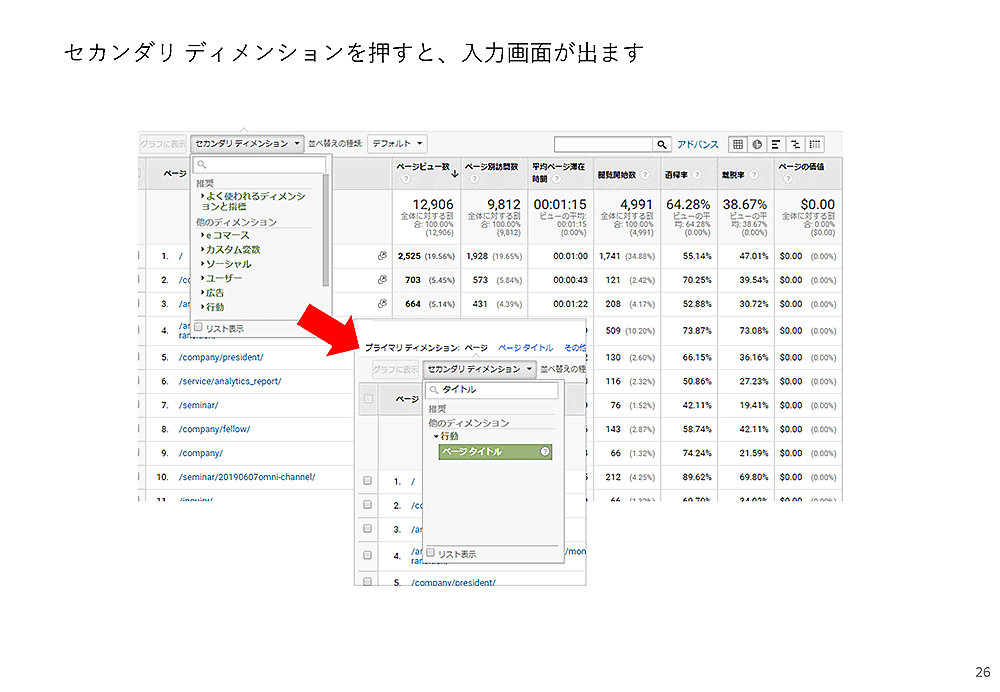 次に、同じ画面で、表の上にある「セカンダリ ディメンション」というボタンを押します。入力画面が出るので、「タイトル」と入力し「ページ タイトル」を選択します。