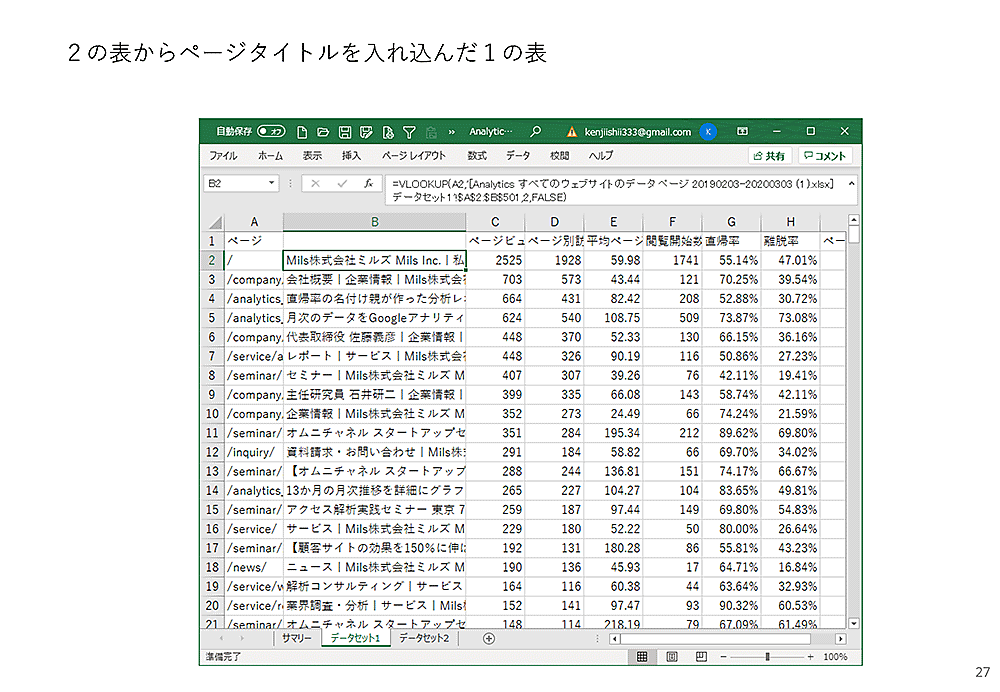 さらに、そのデータをExcelでダウンロードして、VLOOKUP関数を入れれば、ページ別訪問数とそのページの「コンバージョンしたセッション数」とを並べることができます。ここで割り算をすれば、各ページの目標関与率を計算することができます!