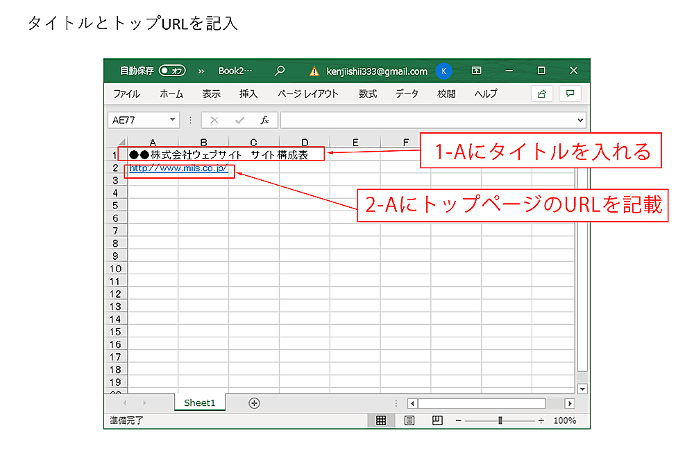 Excelでサイト構成表を作成する方法は大まかに以下のとおりです。