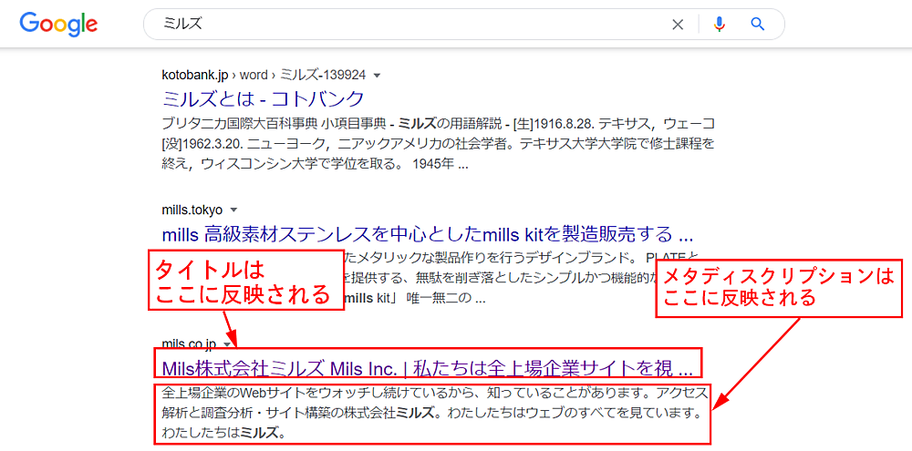 この赤枠部分を「タイトル」「メタ ディスクリプション」と呼びます。「タイトル」はそのページの内容を端的に表す要素です。また、検索エンジンで検索結果に表示される場合は、大体このタイトルが見出しとして利用されます。
