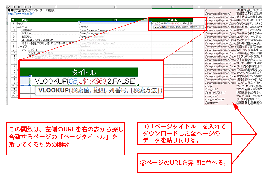 これでURLを突き合わせて合致するページタイトルを、サイト構成表のH列に移すことができました。あとは同じ関数をコピーして全ページのH列の欄にペーストするだけです。