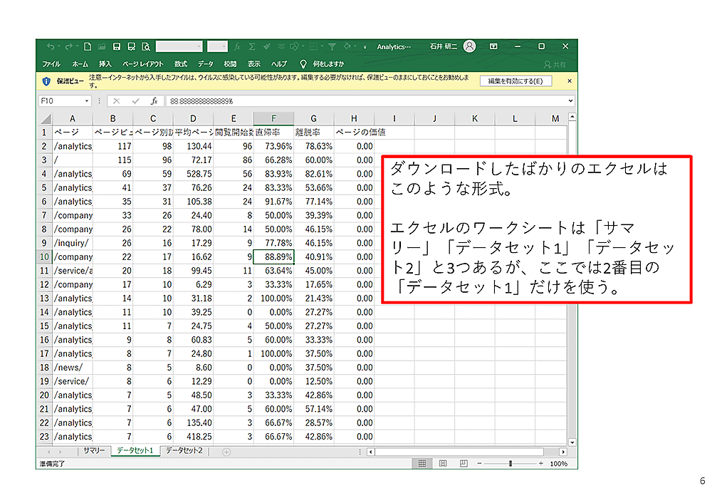 ダウンロードしたデータを見てみましょう。「データセット1」というワークシートが全ページのデータになっているので、これを開き、データをコピーします。ここの例では「ページの価値」は設定していないため、「ページ」から「離脱率」までをコピーします。