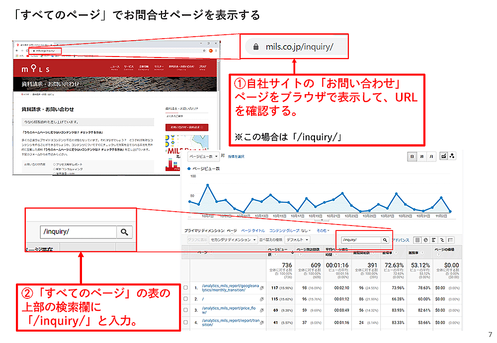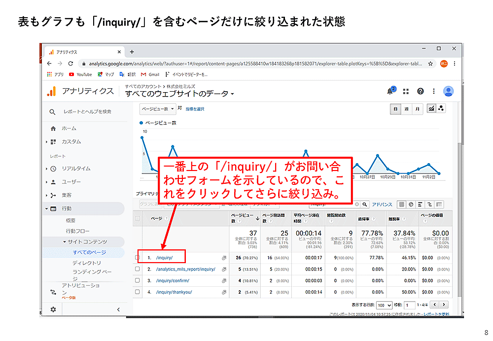 Googleアナリティクスの「すべてのページ」の表の上部に検索欄があるので、そこに「inquiry」と入力します。