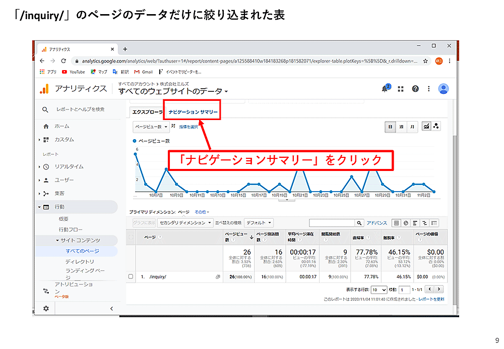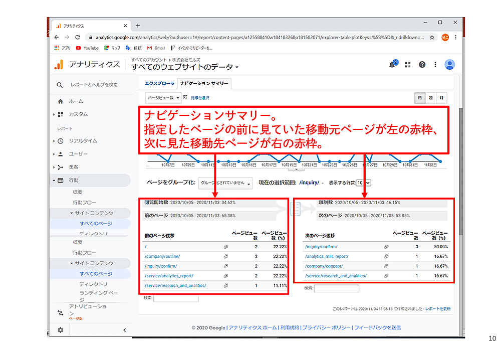 次に、ページ上部にある「ナビゲーションサマリー」をクリックすると、ユーザーが「お問合せページ」を見る前に見ていたページがわかります。