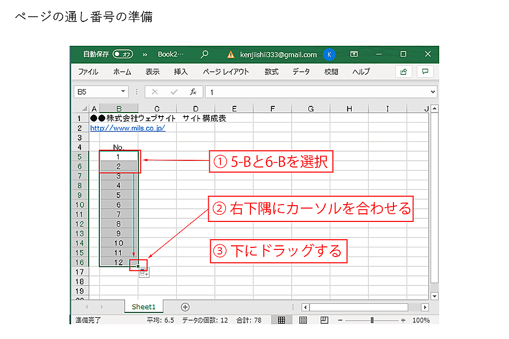 ここで、数字を入れた5-B、6-Bのセルを両方選んで、6-Bの右下隅にカーソルを合わせ、下にドラッグすると、数字がカウントアップされます。「だいたいうちのサイトは100ページくらいあるかな」と思ったら最初に1から100まで数字を書いてしまうと作業がしやすいです。