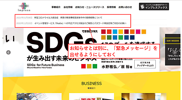 まず、「緊急メッセージ」です。重要なのは、商品に問題が見つかった、社員が問題を起こした、SNSで炎上が確認されたなどのトラブル時です。いち早く会社としての声明を出すことが必要です。また、大災害時に被災者へのお見舞いメッセージを発信することができれば良いでしょう。これらはほとんど、トップページの上部にメッセージエリアをつくって、予定しておくことでクリアできます。トップページの上部に以下のようなエリアを作っておきます。