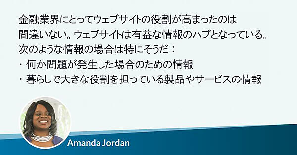 金融業界のクライアントにとってウェブサイトの役割が高まったのは間違いない。ウェブサイトは有益な情報のハブとなっている。次のような情報の場合は特にそうだ: