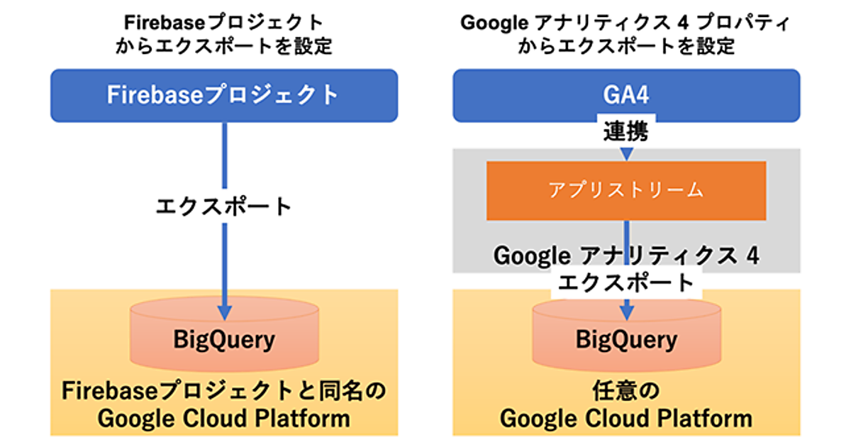 FirebaseプロジェクトからBigQueryエクスポートを設定する場合は、Firebaseプロジェクトと同名のGCPプロジェクトのBigQueryへエクスポートされます。