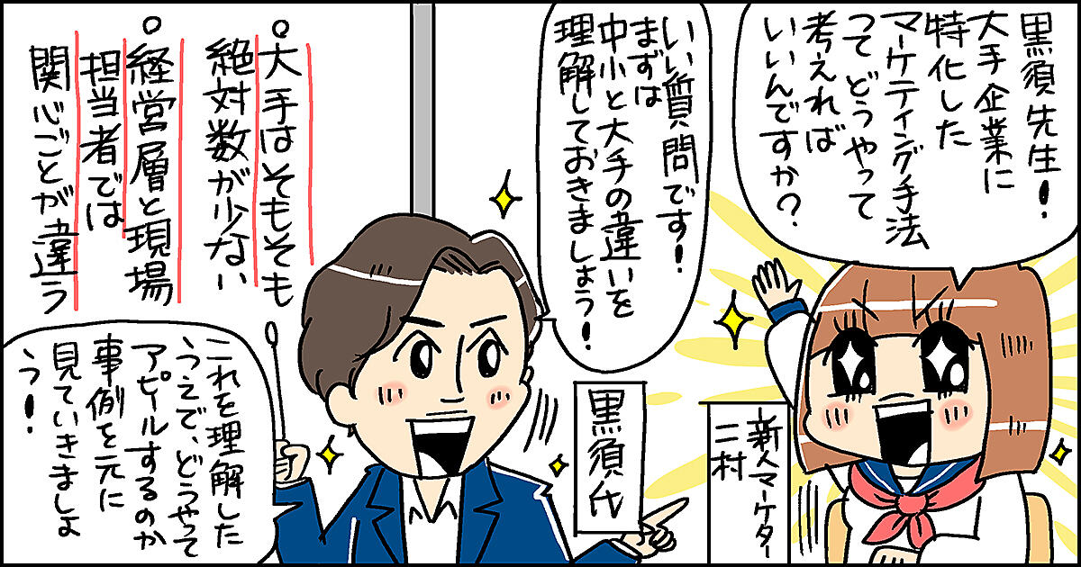 新人マーケター:そうなんですよね。予算も人も限られていますし。なかなか受注にも繋がらなくて……。特に大手企業から受注を取りたいのに上手くいきません! どうしたら良いんでしょうか?