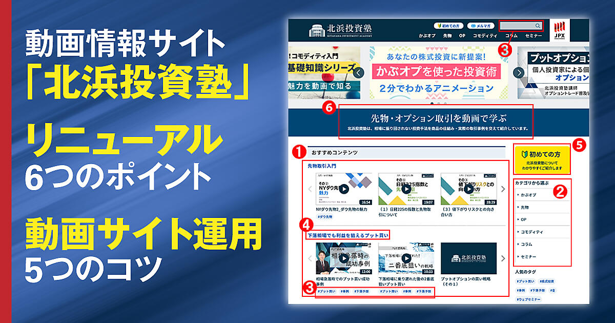 大阪取引所が運営する、動画で学ぶ個人投資家向け投資情報サイト「北浜投資塾」は、取扱商品の追加をきっかけに、たった5か月でリニューアルを実施した。