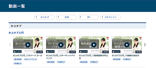 コンテンツの種類として、既存の「先物」「オプション(OP)」「株式投資(かぶオプ)」に、新しく「コモディティ」が加わった。「コラム」「セミナー」などのアーカイブ動画も含めてきちんとカテゴリ分けを行い、グローバルナビに表示、興味のあるカテゴリに簡単に飛べるようにした。
