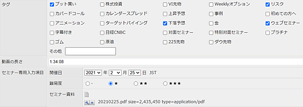 北浜投資塾のメインコンテンツとなる動画はYouTubeにアップしているものの、表示に関しては、ほとんどCMS側でコントロールしている。解説動画の補足情報として、動画のサムネイル、時間表示、難易度、タグ(キーワード)、資料添付など、YouTubeだけでは管理できない情報をCMSでコントロールしている。