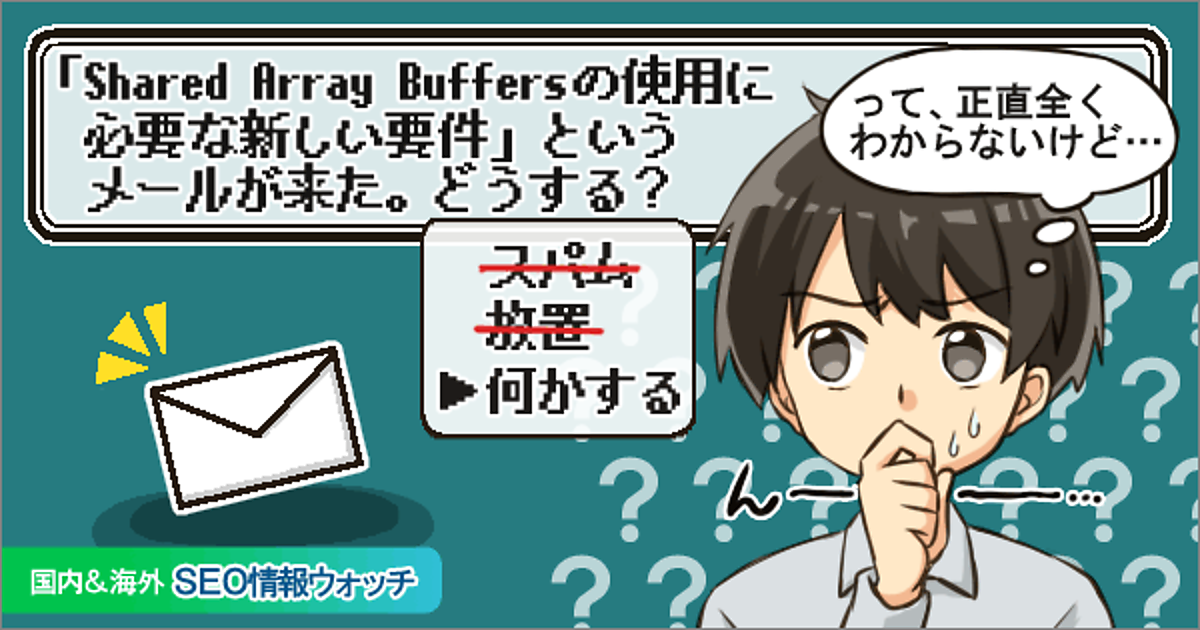 Search Consoleで管理しているサイトに、意味はわからないがなんだかマズそうなメールが来た人がいるのではないだろうか。この「SharedArrayBuffers の使用に必要な新しい要件」は何を意味するのか、どう対応すればいいのかの情報をお届けする。