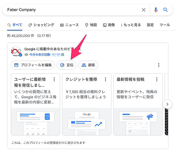 グーグル マイビジネスで管理しているビジネスの名称で検索すると、プロフィール管理のパネルがトップに出てくる。上部の「今月の表示回数:」や、その下の「宣伝」をクリックして「パフォーマンス」を選ぶと、ビジネスプロフィールの利用状況をチェックできる。