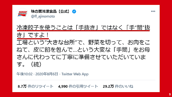「冷凍餃子を使うことは手抜きではなく手“間”抜きである」という同社の一連のツイートは約13.5万回リツイートされ、最終的に44万のいいね!がつくなど大きな反響を呼んだのだ。