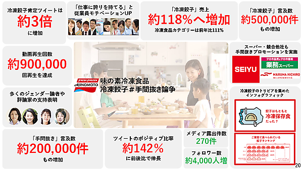 その結果、冷凍餃子の使用を肯定するポジティブなツイートは約3倍に増加した。こうしたTwitterに流れるポジティブな意見は、それまで購買につながりにくかった20代、30代の層に届き、「初めて買った」という声もあがるようになったという。結果として、冷凍餃子市場で前年比118%と大幅に伸長し、売上にも貢献した。