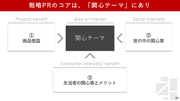 続いてのテーマは、自走する「関心テーマ」。PR施策の成功要因として、本田氏は、「関心テーマ」というキーワードをあげた。戦略PRのコアは、関心テーマすなわち「社会の関心から導かれるテーマ」にあるという。