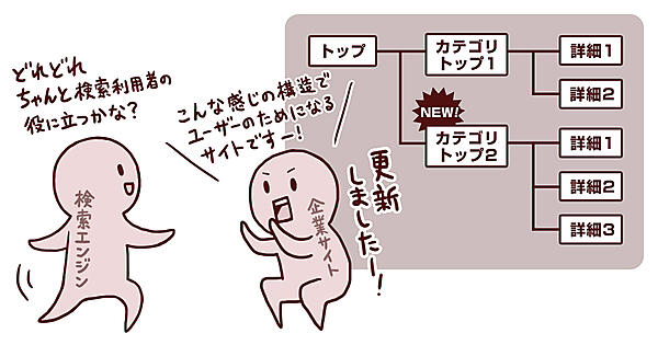 ロボット型検索エンジンは、「重要ページ更新監視ボット」が「部分情報収集ボット」を呼び寄せるという仕組みです。これはつまり、「Googleは『サイトの構造』を学ぼうとしている」と言えます。「どのページが目次になって、検索者に役立つ情報がそこに属しているか」を見ているのです。そこで、Web担当者は目次を作って、その存在をGoogleに教える必要があります。ボットがサイト内に頻繁に訪れるようにするには、以下のようなことが重要です。