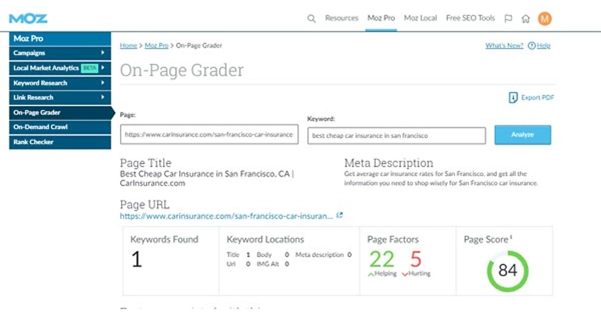 このURLをMoz ProのOn-Page Graderで見ると、非常に強力な取り組みがされていることと、それでも少し調整してさらにあと少し改善する余地があることがわかる。