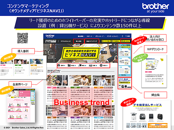 コンテンツマーケティングでのリード獲得にも取り組んでいる。ブラザーグループのWebサイトは製品軸での構成となっているため、“どの製品を買うか決まっている顧客”は利用しやすいが、潜在顧客へのアプローチは不得手だ。そこで、課題を解決・見つけてもらい、類似したケーススタディや導入事例からお客様に合った製品選びを気軽に相談できるオウンドメディア「ビジネスNAVI」を開設し、ホワイトペーパーのダウンロードなどに誘導している。気に入った製品があれば、デモ機の無償貸し出しサービスの導線も用意している。
