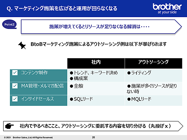 たとえば、オウンドメディアのコンテンツ制作であれば、企画や構成案は社内で作成し、ライティングを外部に依頼する。メールマガジン配信やMA運用は、施策が多いときには定型文やフォーマットが決まっているものの配信を依頼するといった具合だ。また、インサイドセールスにおいては、リードへの“ファーストコール”を外部委託する手もある。