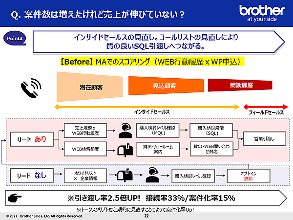 ブラザー販売では、インサイドセールス部隊をマーケティング部門に取り入れている。「BtoBマーケティングを一気通貫の流れで把握したい」との狙いからだ。また、見込み度の低い案件を営業部門に取り次いでしまうと、対応してもらえないケースもあったため、質の高い案件のみ引き渡せるようにインサイドセールス部隊をマーケティング部門に取り入れているという。