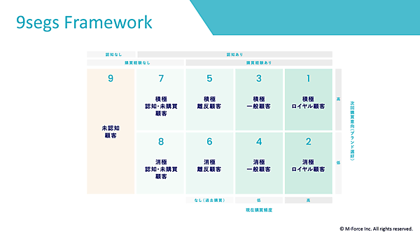 このように顧客を「未認知顧客」→「認知・未購買顧客」→「離反顧客」→「一般顧客」→「ロイヤル顧客」に引き上げていく施策と「消極顧客」→「積極顧客」に変えていく施策は、マーケティングのアプローチが異なるため、それぞれを分けて考える必要がある。そのため、9つの顧客セグメントごとに分析を行い、最適なアプローチ方法を考えていく。