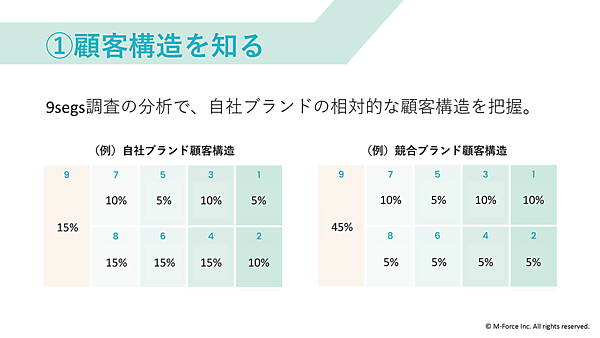 9segsのなかで自社ブランドの成長に欠かせないセグメントがどこなのかを定める。たとえば、9segsに自社ブランドの調査結果と競合ブランドの調査結果をプロットしたシートをそれぞれ比較しながら検討していく。
