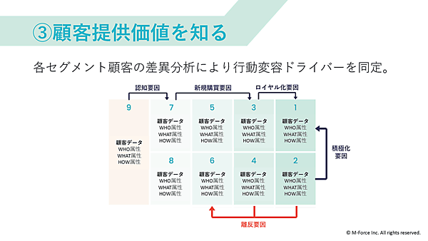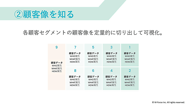 ここで、M-Force社で導入支援している「9segs(ナインセグズ)」というフレームワークについて解説していった。9segsとは、顧客を9つのセグメントに分解して分析することで、ビジネスを成長させる顧客戦略を導くフレームワークだ。顧客戦略とは、「誰に(Who)、何を(What)提供するのか」というマーケティングの本質的な部分のことを指す。