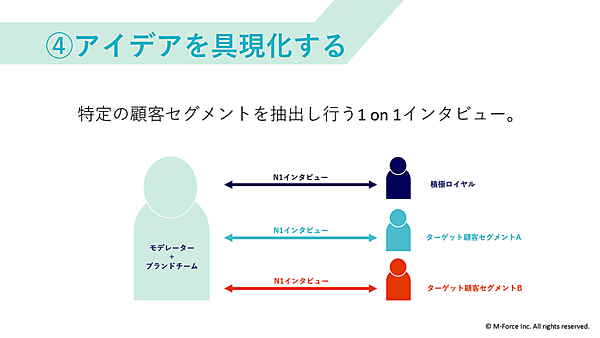アイデア出しのフェーズではN1調査と言って、それぞれのセグメントの中で象徴的な人物にデプスインタビューを行う。たとえば、彼らがそのブランドを使っている理由など、背景を掘り下げる作業をしていきながらアイデアを作って行く。