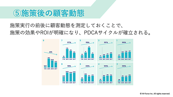 このように、9segsにプロットされた値を見ながら、「どの顧客セグメントに強いのか」「弱い部分はどこなのか」「どこを伸ばすべきか」といったことを、把握していく。