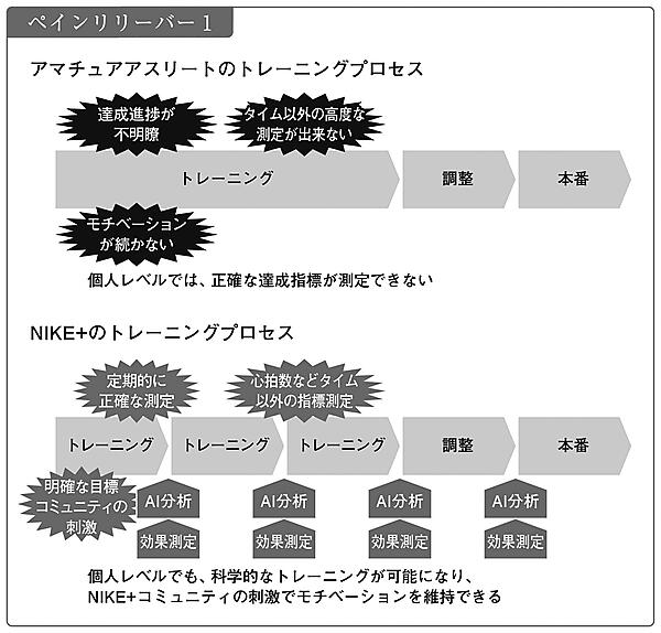 そのNIKEが大きくプロセス変革をしたのは、2006年のNIKE+から始まったデジタルシフトです。NIKE+はデータ測定をトレーニングに持ち込むことで、2つのペイン除去に貢献しています。