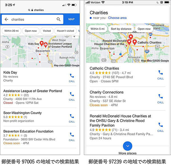 同じポートランドでも、検索ユーザーの所在地によってローカル検索結果はまったく違う