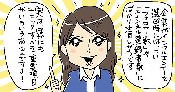 さて、企業がインフルエンサーを選び出そうとする際には、「フォロワー数」や「チャンネル登録者数」を判断材料にすることが多いようです。たしかに指標としてはわかりやすいのですが、それ以外にも、以下に挙げる重要項目についてもあわせて確認し、慎重に人選することをお勧めします。