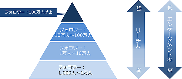 では、自社の商品・サービスのPR施策を託すにふさわしいインフルエンサーを、どのように選べばよいのでしょう? 「インフルエンサー」と一言でいっても、そのフォロワー数やチャンネル登録者数によって「トップインフルエンサー」「マイクロインフルエンサー」「ナノインフルエンサー」のように分類される場合があります。