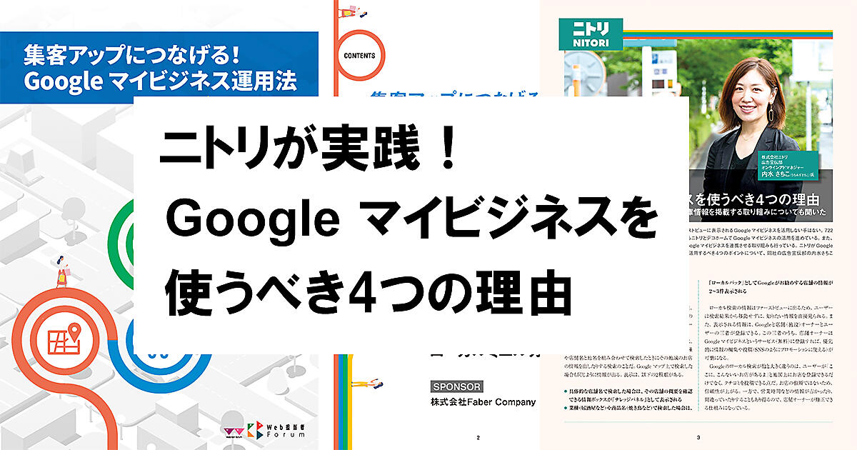 ホワイトペーパー「集客アップにつなげる! Google マイビジネス運用法」では、ニトリがGoogle マイビジネスをどう活用しているのか、Google マイビジネスを活用するべき4つのポイントについて詳しく解説するとともに、Google マイビジネス活用において役立つローカルSEOツール「ローカルミエルカ」(Faber Company)も紹介している。