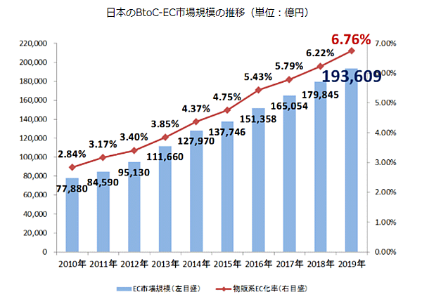 ECの普及・浸透は凄まじいものがある。しかし、経済産業省がとりまとめた調査によれば、国内の全ての商取引に対する一般消費者向けの物販系電子商取引(BtoC)の割合は2019年時点で6.76%に過ぎない。