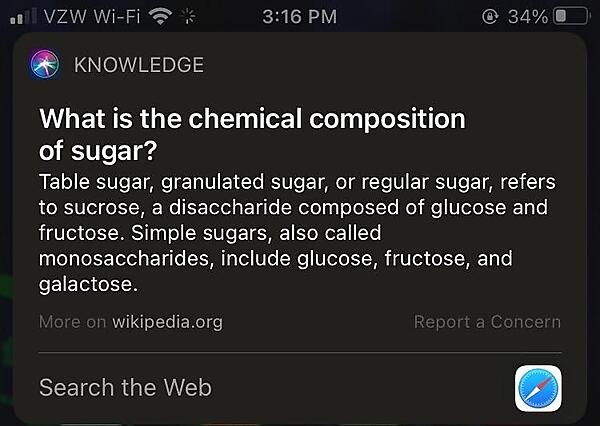 「砂糖の化学的成分は?」といった種類の問いに対しては、Wikipediaの結果が表示されやすい