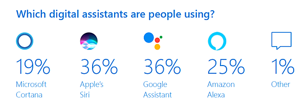 マイクロソフトのThe 2019 Voice Reportでは、使用したことのあるデジタルアシスタントを挙げるよう回答者に求めており、これらの各エンジンから期待できる音声検索トラフィックを大まかに把握できる。アップルのSiriとGoogleアシスタントが同率1位で、市場シェアはそれぞれ36%だ。アマゾンのAlexaはデジタルアシスタントの利用率全体の25%を占めており、続いてマイクロソフトのCortanaが19%となっている。