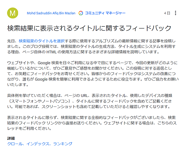 問題だと感じるタイトルを検索結果で発見したらグーグルにフィードバックしてほしい。アルゴリズム改善に役立てられる。フィードバックは、(日本の)検索セントラル ヘルプコミュニティのこちらのスレッドで受け付けている。