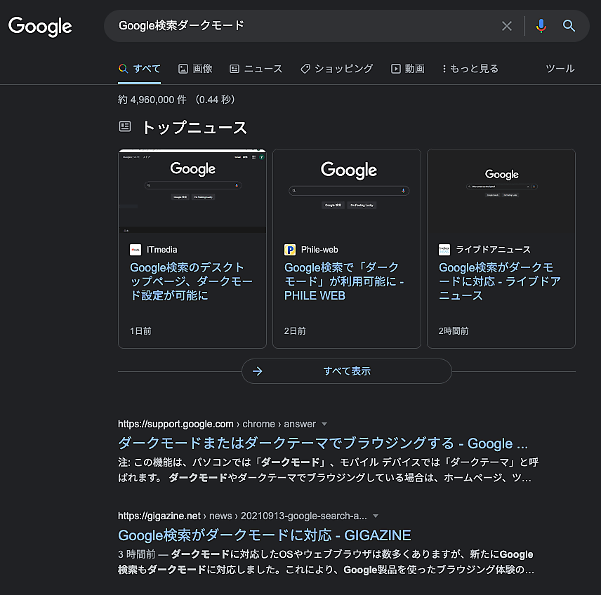 ダークモードの検索結果はこんな感じだ: