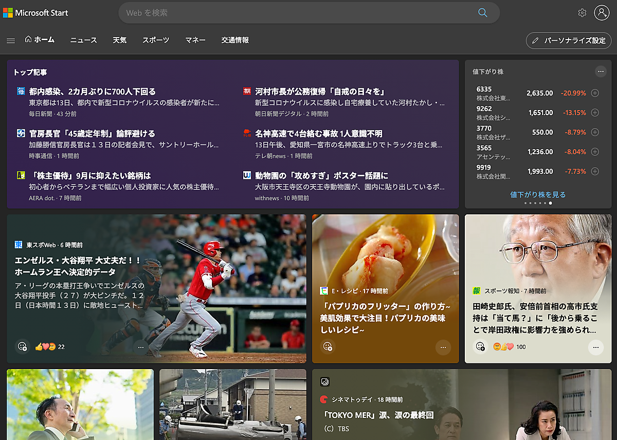 一見するとふつうの「MSNニュース」に見えるが、その中身はグーグルが提供する Discover のマイクロソフト版といったところか。