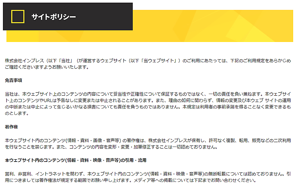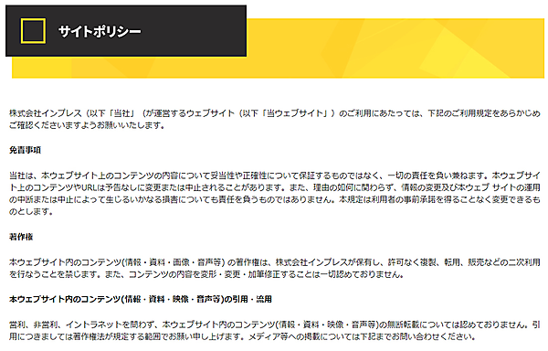 では、具体的にWeb担当者Forumの運用会社であるインプレスのサイトポリシーを例に、記載項目をみていきましょう。