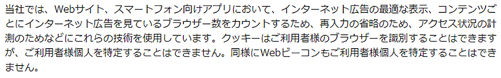 ここで、2-17のプライバシーポリシーで、インプレスが「Cookie、Webビーコンについて」記していたことを思い出してください。CookieやWebビーコンをなぜ用いているのかを記したうえで、それは個人を特定する情報ではないことを明記していました。