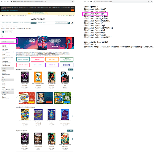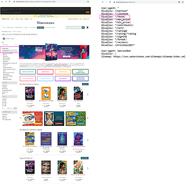 https://www.waterstones.com/category/childrens-teenage/facet/498)右図: robots.txtファイルの内容。線で囲んだ部分は絞り込んだページに対応する記述で、このURLに対するクロールを禁止している