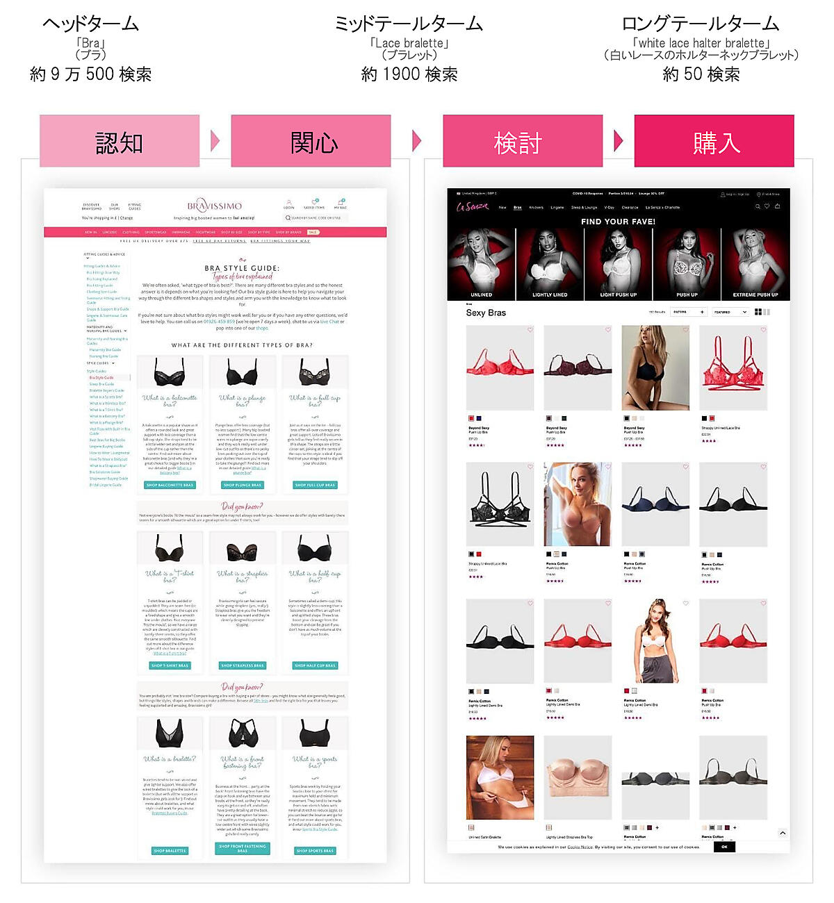 次の図を見てほしい。これは、ブログ記事や着こなしガイドなどの編集コンテンツと商品一覧ページで、購買ファネルの異なる部分をターゲットとしていることを示している: