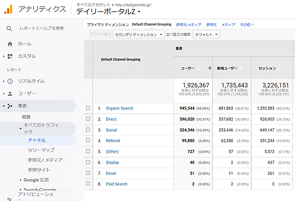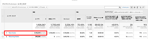 ユーザー(訪問者数)が1,926,367。ユーザー当たりのセッション数(平均訪問回数)が1.67、ページ/セッション(平均PV数)が1.95です。まず訪問者数から詳しく見ていきましょう。